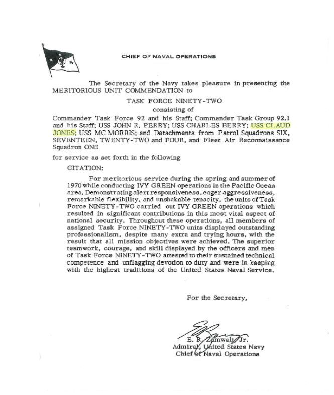 CLAUD JONES remained at sea for 71 consecutive days despite adverse weather and limited support making use of underway replenishments with the USS PIEDMONT (AD17), USS KIWISHI (AO-146) and USS SACRAMENTO (AOE-1), plus two brief refueling stops in Midway. The efforts of CLAUD JONES contributed significantly in making this Pony Express Operation a most successful operation. In addition, Project Teal Gull was modified and conducted while on station, further demonstrating the versatility of CLAUD JONES.
