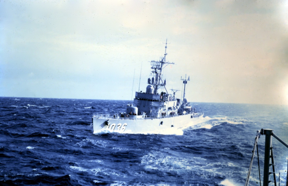 Another incident occurred on the McMorris while we were on station. There was a failure in the hydraulic steering gear during a turn. As a result, the ship could only continue that turn until the steering gear was repaired. As a result, the ship sailed around in a circle for about two hours while repairs were under way. Since the ship could not maneuver, it had to hoist a day signal indicating that it was not under control. (The mnemonic we learned at OCS was “Red over Red, the captain is dead”. No captain likes to hoist that signal! Another downside to the situation was that it occurred near lunch time and we could not take a course to minimize rolling during the meal. During that lunch and other meals in rough conditions, the officers got very good at eating with one hand while holding our plates in place with the other. The crew in the enlisted mess actually had it easier. Their food was served on standard metal tray with four areas with raised edges that minimized sloshing. The crew mess was also a deck lower where there was less ship’s motion to move the food around. It was almost funny watching the officers handle the soup course: one hand tilting the bowl to keep the soup in place while the other maneuvered the soup spoon.