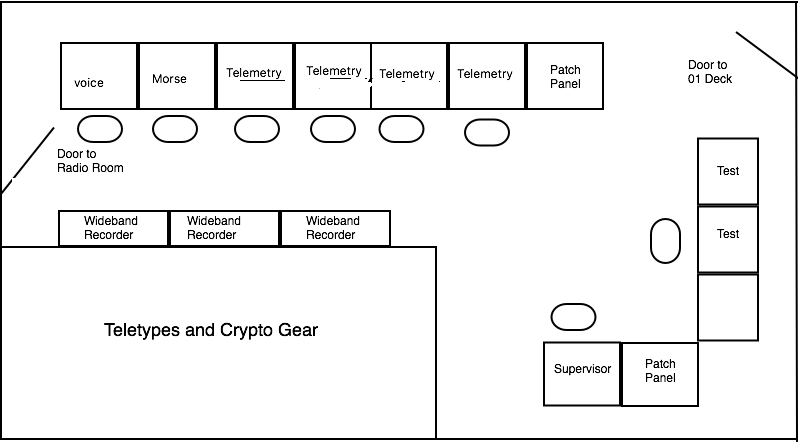 The telemetry intercept positions were arrayed along one side of the compartment. A comfortable chair was bolted to the deck in front of each position. The chairs had to be bolted down because the ship would roll as much as 30 degrees in heavy seas.
