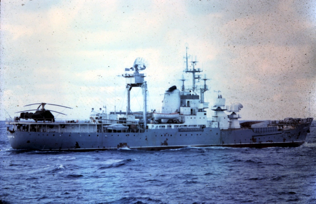 While we were watching the SMRIS, they were watching us. They had the advantage that some of them had onboard helicopters. The ones we saw were the KH-47 with two counter-rotating rotors. The helicopter would fly around us while both side took photographs. They would generally stay a few hundred yards from us and not make provocative moves. Unlike other barely-armed surveillance ships such as the USS Liberty and USS Pueblo, we had two 3” dual purpose guns with anti-aircraft capability. There were times when the helicopter would close to about fifty yards upwind, then “bounce” down to about 30 feet in altitude. When they did this, the rotor wash would kick up a lot of spray which would wash over the ship. When this happened, the bridge crew would retreat inside and close the hatches. Luckless sailors and CTs on deck would turn their backs and hide their cameras under their jackets.